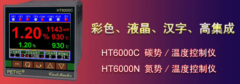 | (5) 將本公司多年碳勢控制工藝和儀表開發使用經驗與當前電子技術發展成果結合,2007年開發成功HT6000C彩色液晶漢字可編程碳勢控制儀(碳控儀)和HT6000N彩色液晶漢字可編程氮勢勢控制儀(氮控儀)。 |